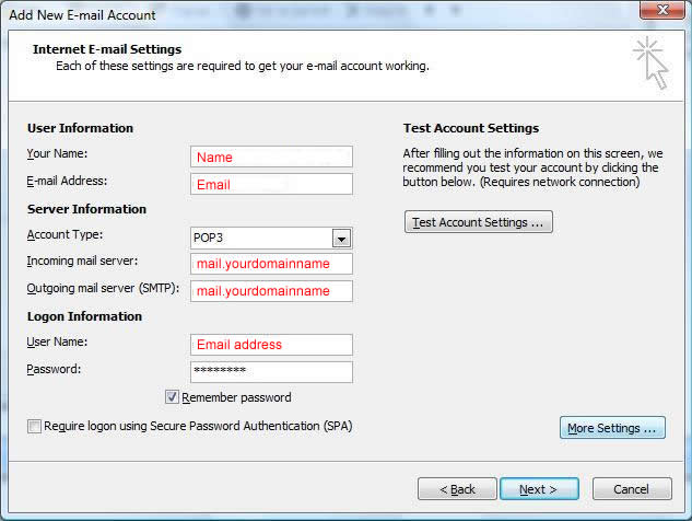 Step 6: Click on the More Settings button in the bottom right hand corner and select Outgoing Server tab