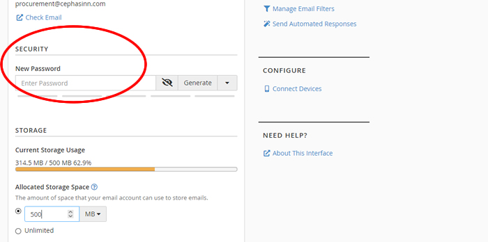 Step 5: Type the new password or click generate and click Update Mail Settings